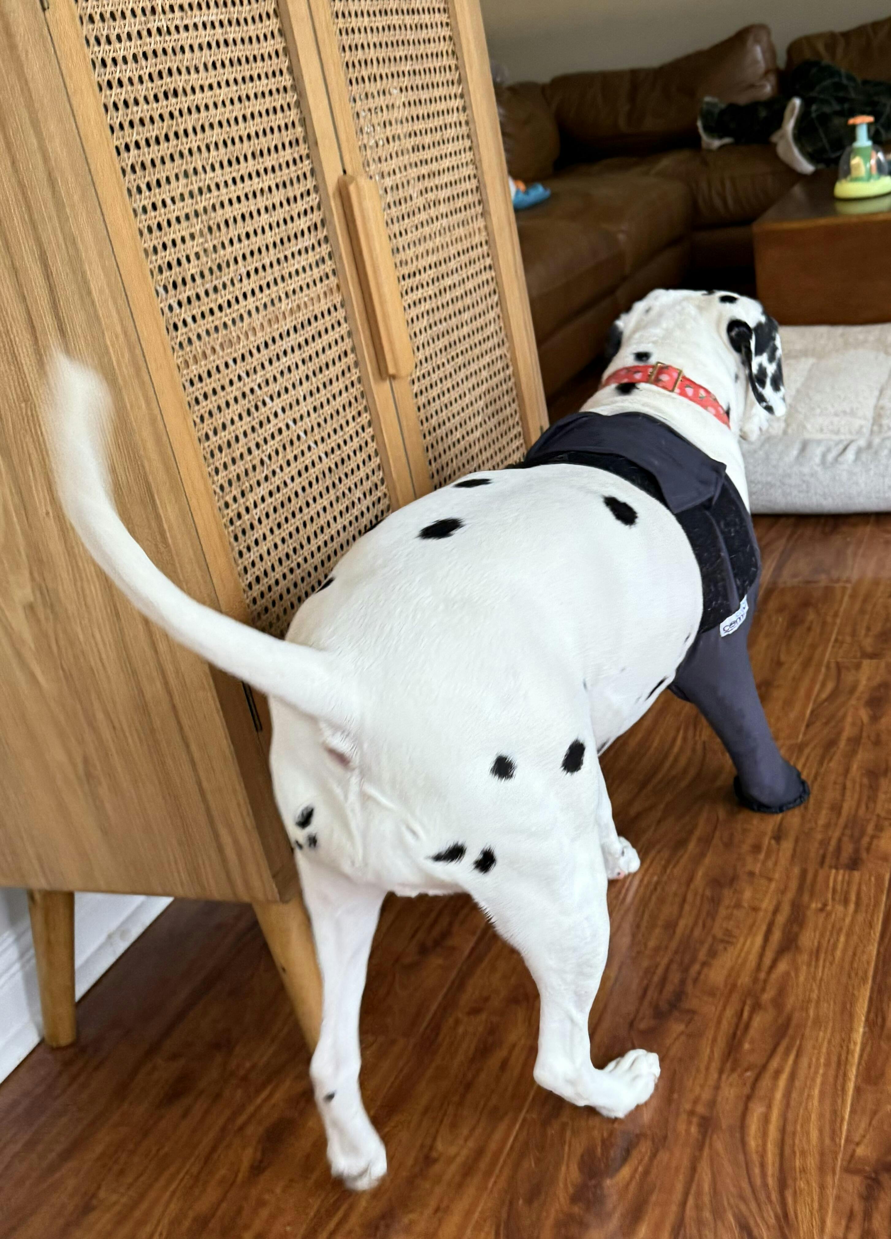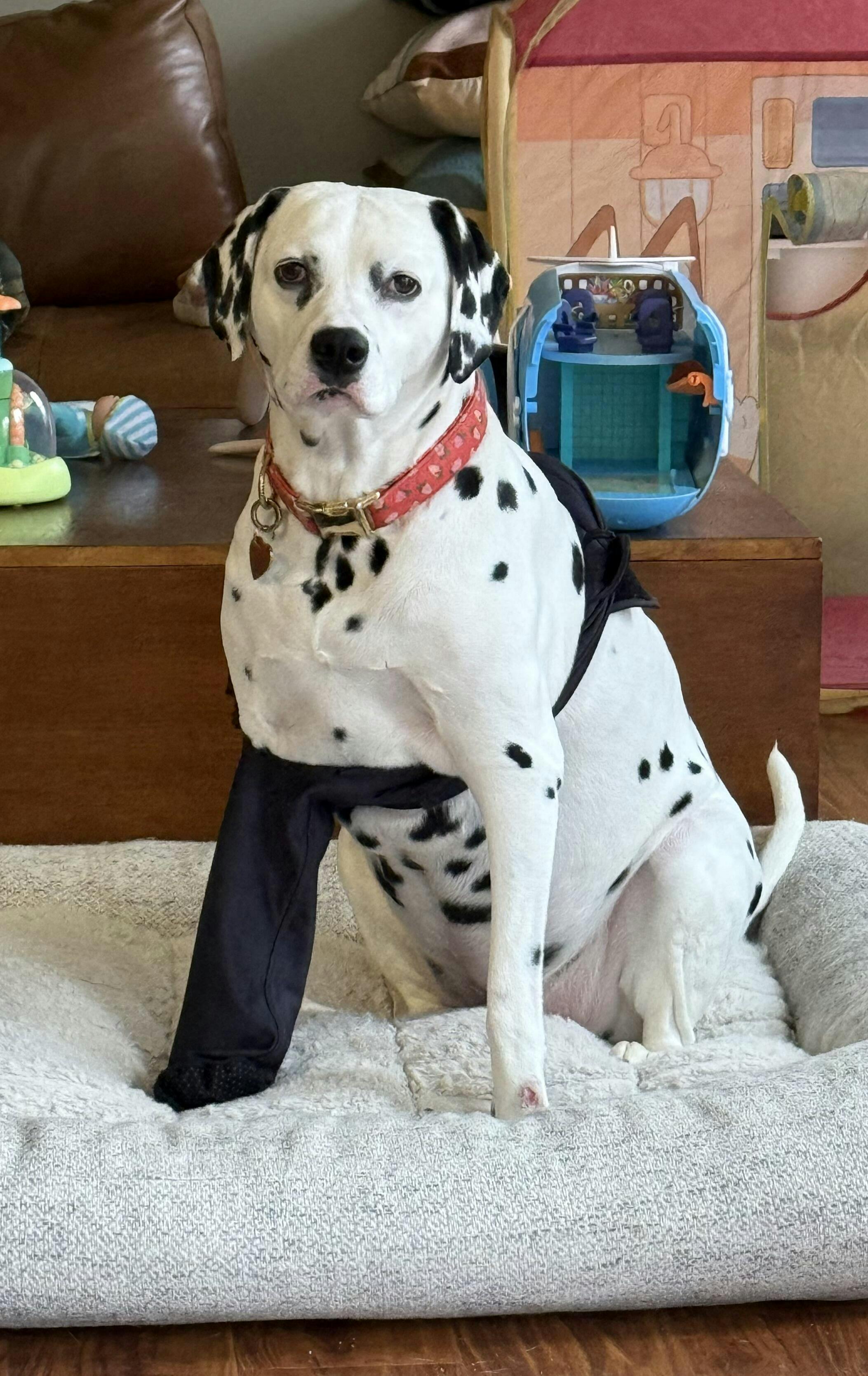 The Canine Comfy Front Leg Sleeve is perfect when only a front leg or paw needs to be covered. We make the sleeve with and without paw coverings. The paw covering is made with a non skid bottom so you don't have to worry about your healing pup sliding all over.